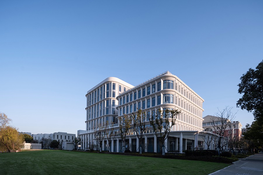 设计立意取自诗句“藕花深处田田叶,叶上初生并蒂莲”。花中珍品并蒂莲集莲荷之精华于一身,尤能引人入胜,在古代人们视并蒂莲为吉祥、喜庆的征兆,善良、美丽的化身。本设计中塔楼与裙房一大一小,形体体量近似,犹如一枝并蒂莲上开放的两朵花。本项目的落成将为高端的生物医药企业提供研发制造物理空间,同时包含研发、生产、办公,能够对整个周边环境和生产配套起到提升和引领作用。